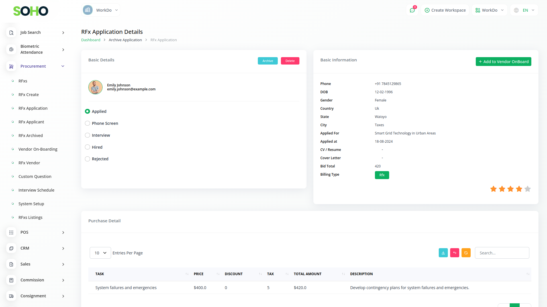 Managing the procurement process can be a time-consuming and complex task. SOHO SaaS simplifies this process by providing a central hub for all your procurement needs. Create purchase orders, manage vendor information, track spending, and gain real-time insights into your procurement activities – all within a user-friendly interface.
