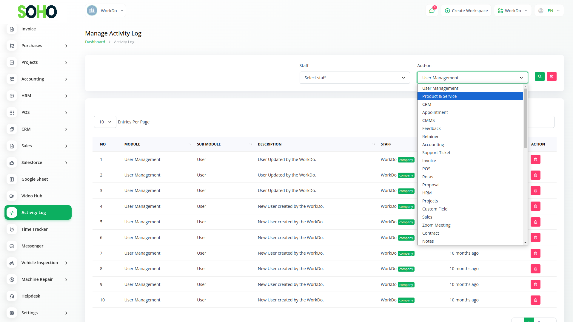 The activity log shows you the activity happening within the modules along with time and according to the appropriate formate. For example, when you create a new object inside any module and edit it, the activity log will show you that activity.