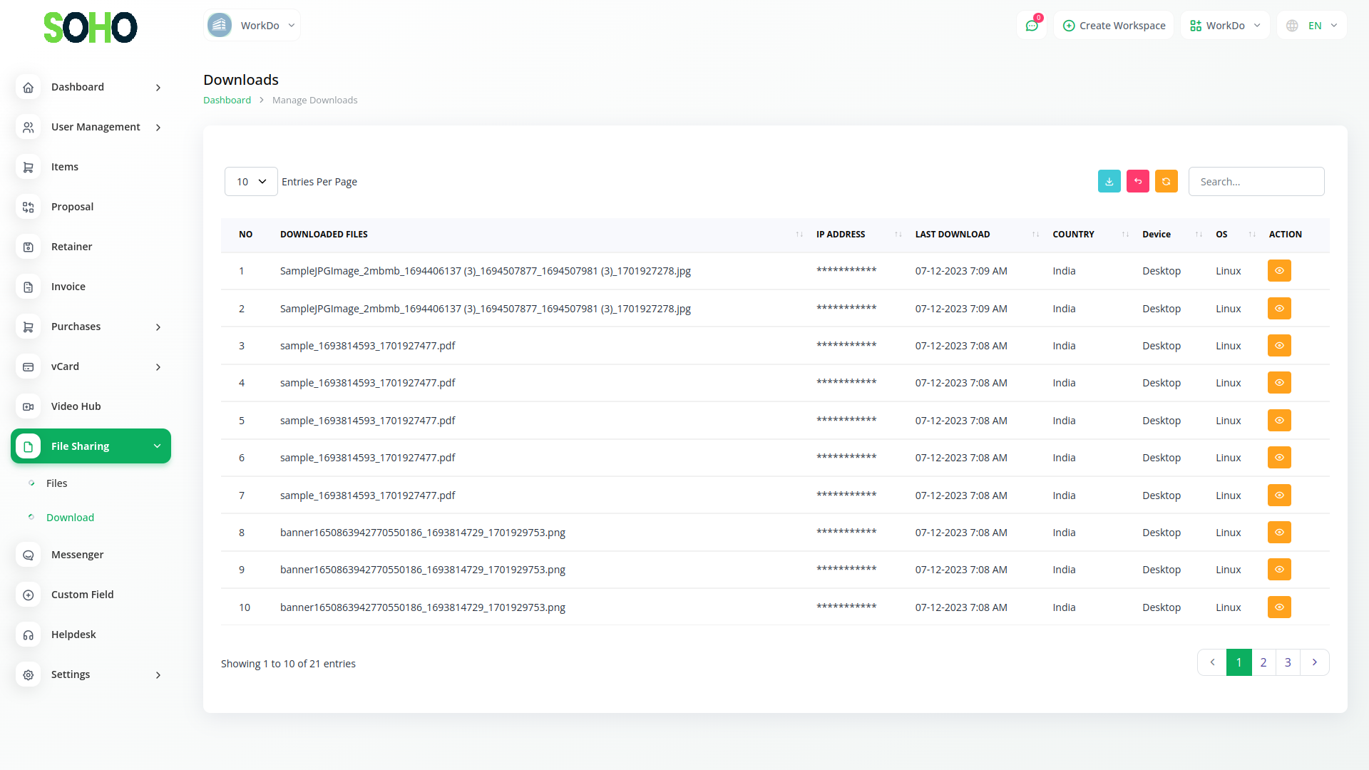 In file download management, you can know and view file name, IP address, date, country, device, OS etc. when a file is downloaded.