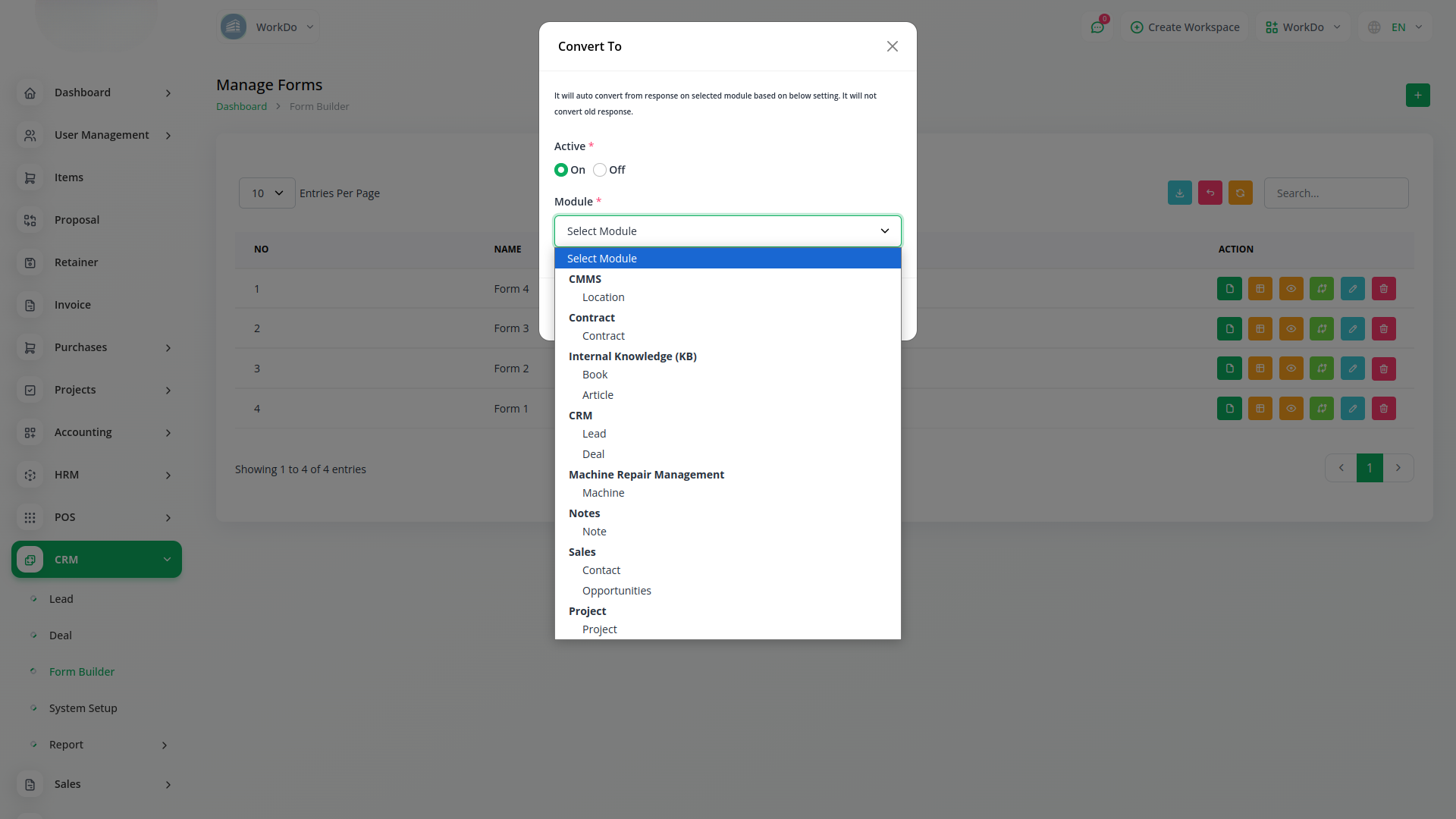 Within our platforms Actions section, youll find a range of functionalities tailored to streamline your workflow. Here, you can effortlessly copy the form link, access form field editing or viewing options, review responses, and seamlessly convert forms into leads or CRM entries. When transforming a form into a lead, all details are seamlessly transferred to the lead column. Conversely, converting it into CRM enables convenient form filling directly from the frontend. Additionally, you retain the flexibility to edit the form name to suit your preferences.