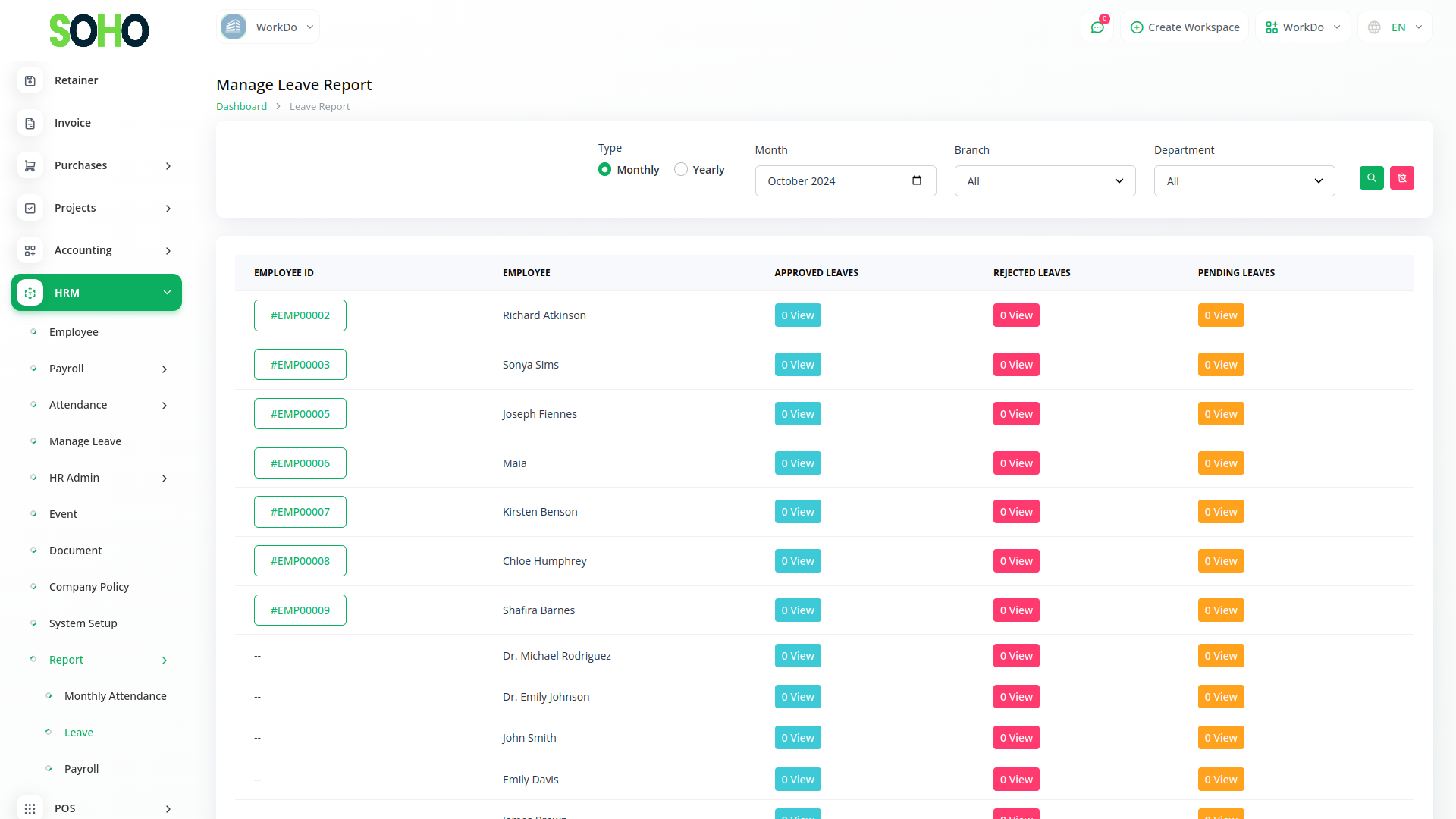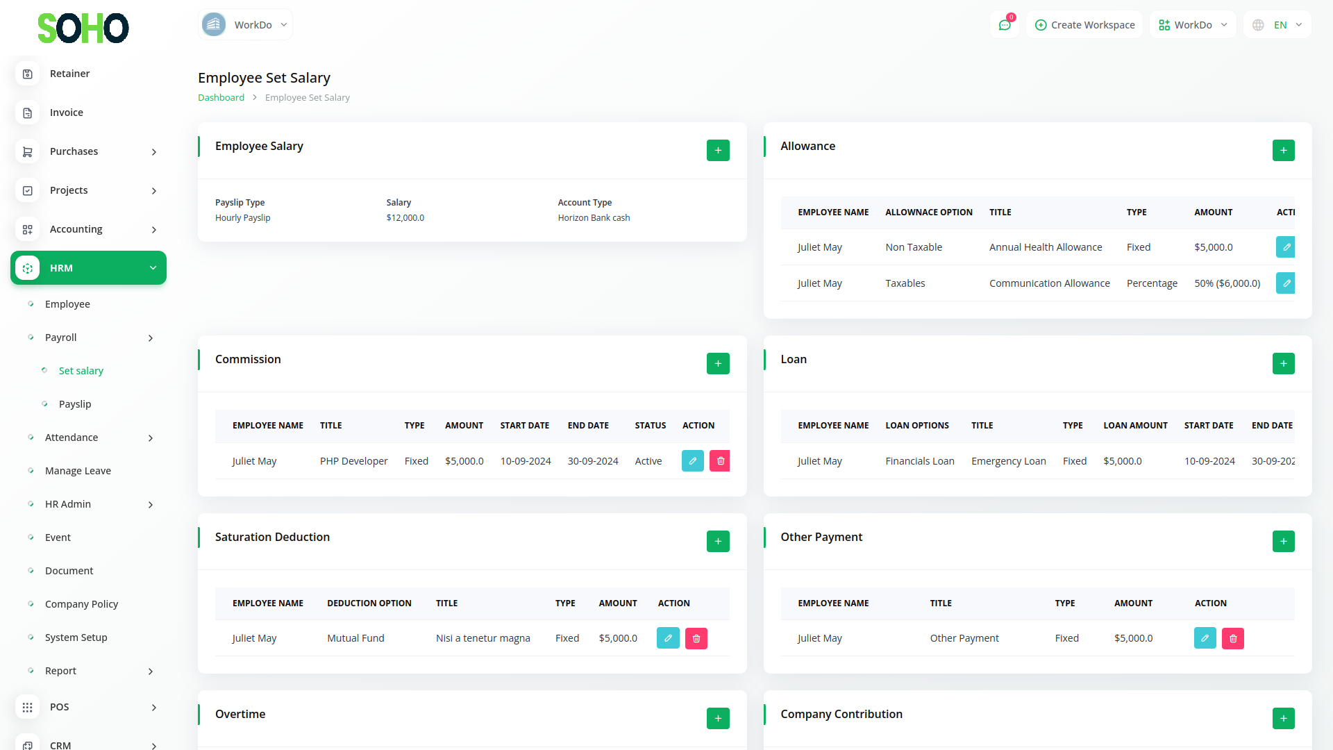 With SOHO ERP HRM, you can manage key employee matters, recruit new candidates, boost employee productivity, and pay your employees for their hard work - Without stress, all from one place. Whether youre a consultant, small business owner, or large corporation - the system is designed for everyone.
