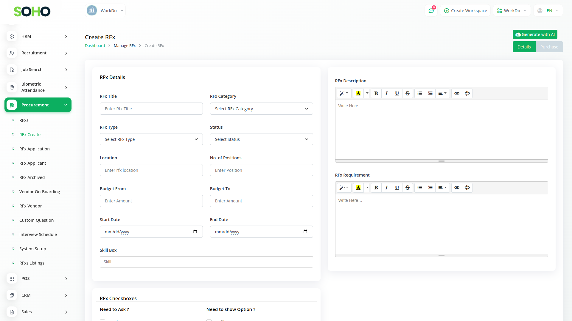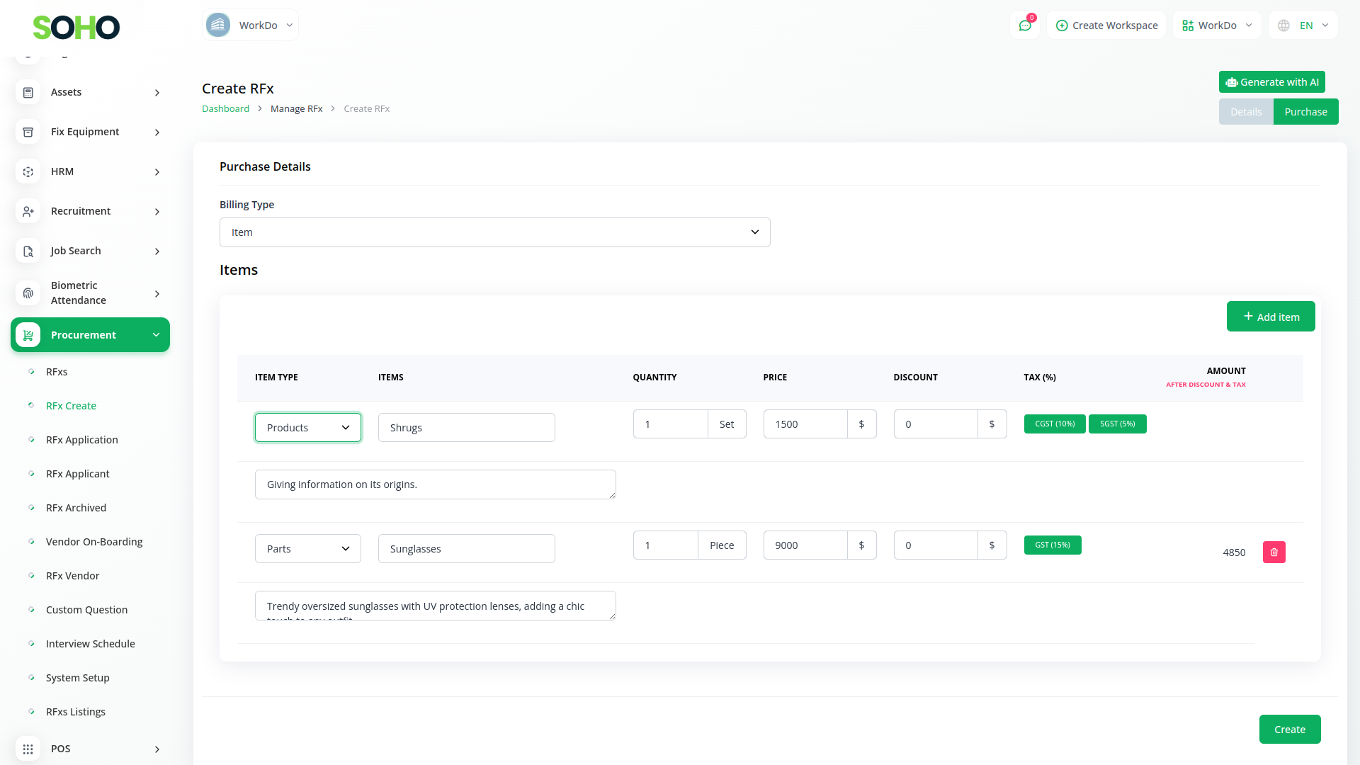 Managing the procurement process can be a time-consuming and complex task. SOHO SaaS simplifies this process by providing a central hub for all your procurement needs. Create purchase orders, manage vendor information, track spending, and gain real-time insights into your procurement activities – all within a user-friendly interface.